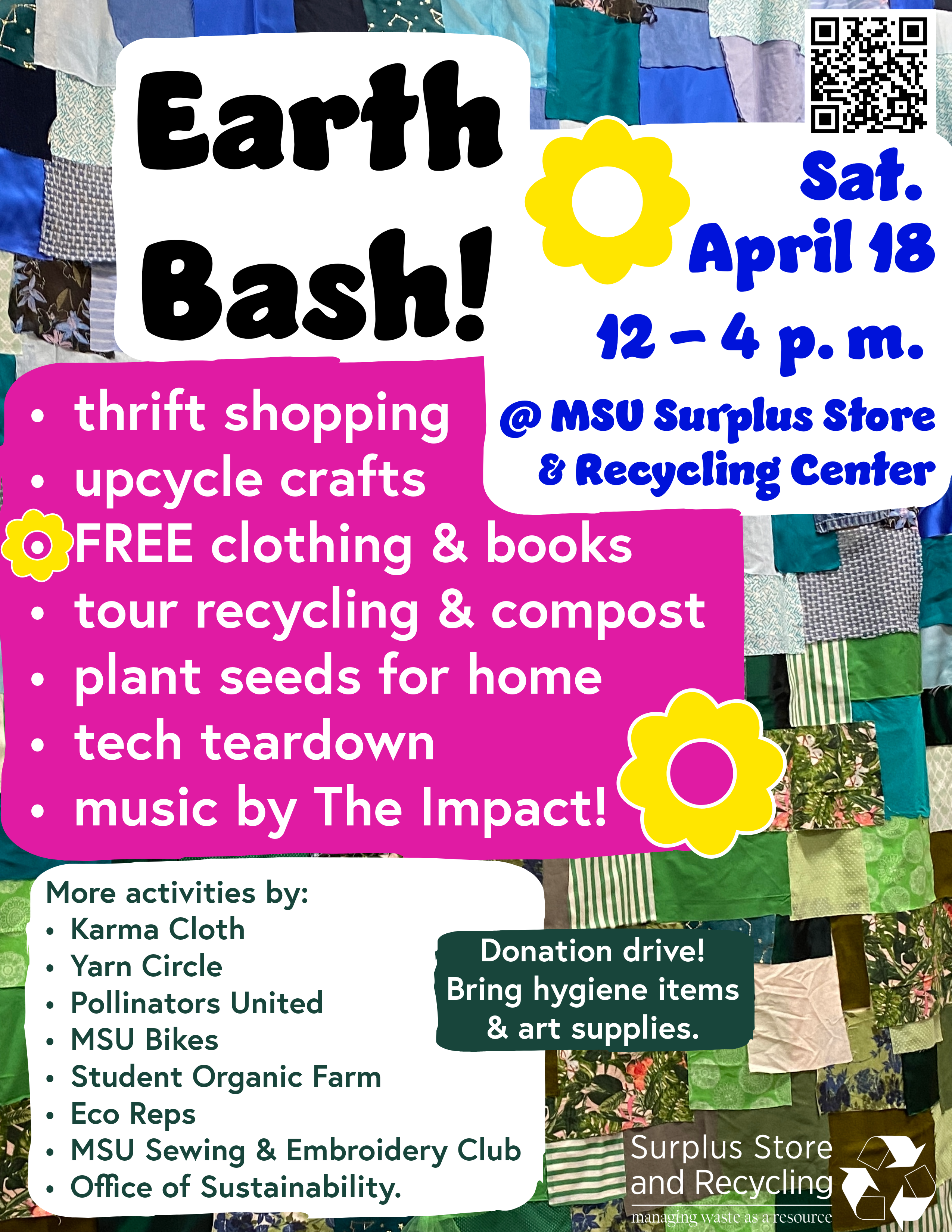 Celebrate all things reduce, reuse, recycle with a day at the campus recycling center and thrift store. Go secondhand shopping, tour the material recovery facility and vermicompost hoophouse, and make upcycled crafts, all while listening to music provided by IMPACT 89FM! Plus pick through over 2,000 lbs. of free clothes (adults and kids) and take home your favorites. Plus, bring any personal hygeine products or art supplies to donate as part of our collection drive. Supplies will be made available to MSU Students and local teachers. Let's go green!
