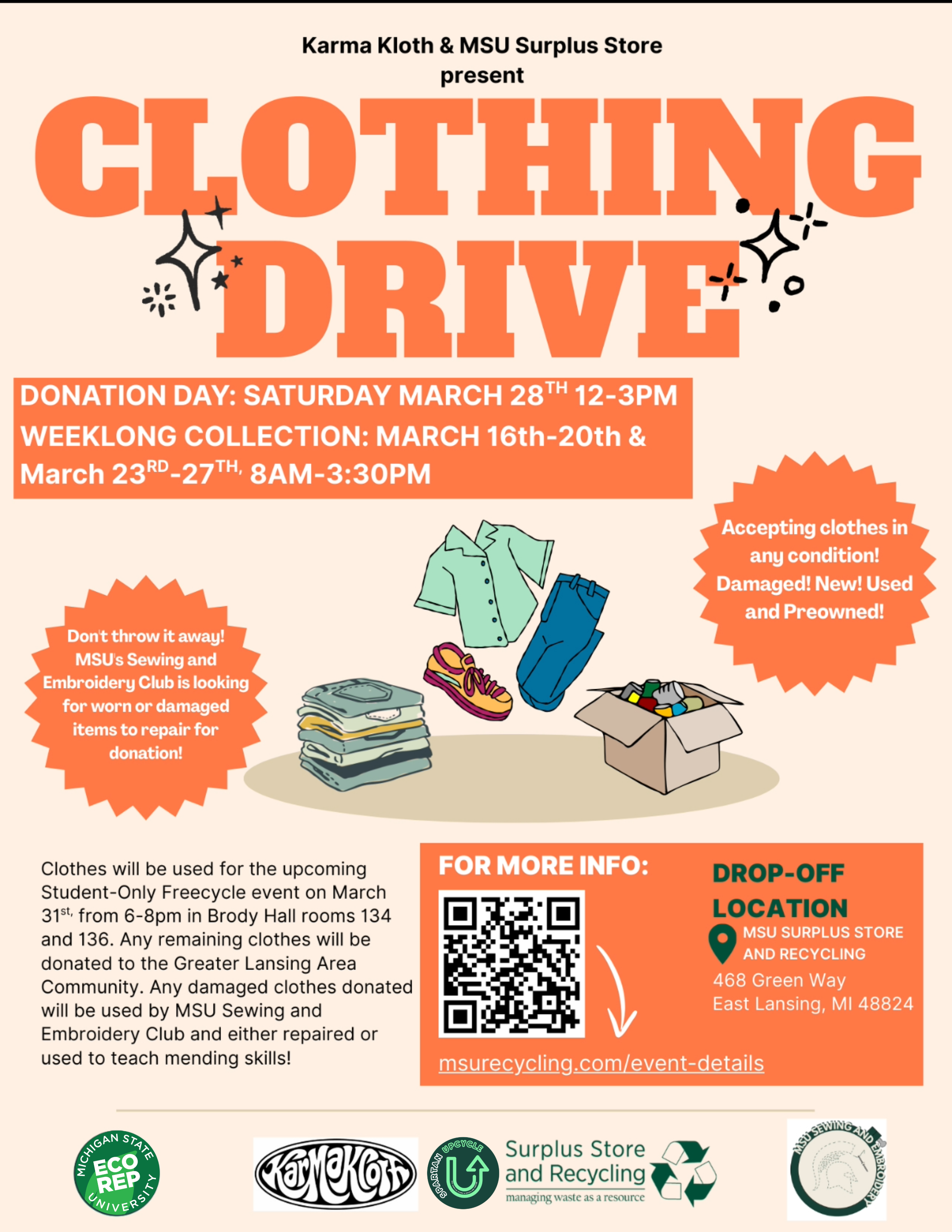 Hoping to make sure your unwanted garments end up back in circulation, and not in a landfill? Support MSU SSRC and Karma Kloth by donating your used clothing as part of our upcoming Clothing Drive! Clothing will be accepted in any condition. Even the most worn and damaged textiles will be used by MSU's Sewing and Embroidery Club to teach mending skills. Donations will be used for an upcoming Student-Only Freecycle event on March 31st. Any remaining clothes will be donated to the Greater Lansing Area Community.